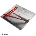 ميزان إلكتروني يقيس وزن الجسم، له تصميم هندسي مصنوع من زجاج آمن متين، يتميز بتصميم شاشة مميز مع صورة مطبوعة، وشاشة الأرقام غير مرئية تظهر فقط أثناء القياس