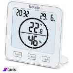 - له شاشة كبيرة وسهلة القراءة تعرض درجة الحرارة، الرطوبية النسبية، والتاريخ والوقت