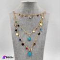 سنسال نسائي مصنوع من الستانلس ستيل الذهبي الممتاز، يتميز بتصميم رائع وجذاب حيث يأتي بشكل ثلاثة أدوار مع أحجار زرقاء كبيرة بشكل دمعة، مما يضفي لمسة أنيقة على رقبتك