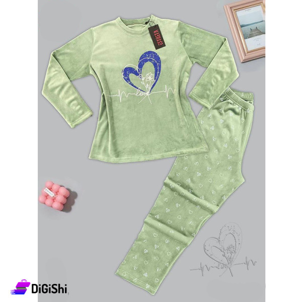 بيجاما نسائية مخمل وجهين دبل لون أخضر فاتح مع طبعة قلب