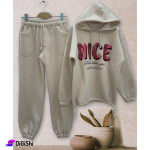 بيجاما نسائية قطن فليس مكفول مع طاقية وطبعة NICE لون بيج