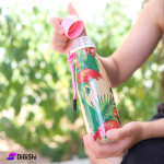 مطرة ماء مصنوعة من البلاستيك بجودة عالية، مصممة بشكل لطيف وملفت، تتميز برسمة طائر الفلامينكو مع خلفية تصف الطبيعة، و بغطاء يمنع تسرب الماء منها حتى عند وضعها في الحقيبة، بالإضافة إلى تعليقة على الجانب لتساعدك في حملها، كما أنه يسهل الشرب منها مباشرةً