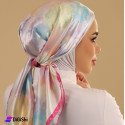 حجاب شكل إشارب مربع، مصنوع من قماش الساتان الذي يتميز بالجودة والمتانة العالية ، يتميز بشكلها المربع الرائع وبنقشات وألوان الصيف الزاهية
