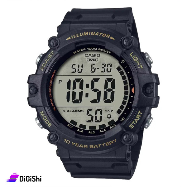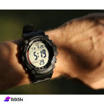 ساعة يد رجالية، بتصميم رياضي أنيق، مصنوعة من مادة الراتنج عالية الجودة والمقاومة للعوامل الخارجية، تأتي مع ميزات يومية مفيدة مثل ساعة الإيقاف والمنبه والمؤقت، وبطارية بعمر 10 سنوات