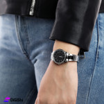ساعة يد نسائية، بتصميم أنيق كلاسيكي وفاخر، مصنوعة من سوار ستانلس ستيل مقاوم للصدأ، ومشبك ثلاثي الطيات، تتميز بشاشة عرض تناظرية مصنوعة من الزجاج المعدني
