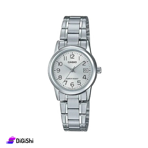 ساعة يد نسائية، بتصميم أنيق كلاسيكي وفاخر، مصنوعة من سوار ستانلس ستيل مقاوم للصدأ، ومشبك ثلاثي الطيات، تتميز بشاشة عرض تناظرية مصنوعة من الزجاج المعدني