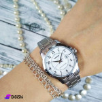 ساعة يد نسائية، بتصميم أنيق كلاسيكي وفاخر، مصنوعة من سوار ستانلس ستيل مقاوم للصدأ، ومشبك ثلاثي الطيات، تتميز بشاشة عرض تناظرية مصنوعة من الزجاج المعدني