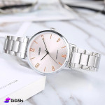 ساعة يد نسائية، بتصميم أنيق كلاسيكي وفاخر، مصنوعة من سوار ستانلس ستيل مقاوم للصدأ، ومشبك ثلاثي الطيات، تتميز بشاشة لون زهر، وعرض تناظري مصنوعة من الزجاج المعدني