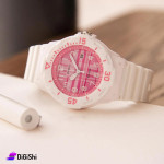 ساعة يد نسائية، بتصميم أنيق كلاسيكي وفاخر، مصنوعة من مادة السيليكون المتين، تتميز بشاشة عرض تناظرية مصنوعة من الزجاج المعدني، مزودة بمؤشر لعرض التاريخ