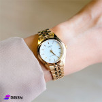 ساعة يد نسائية، بتصميم أنيق كلاسيكي وفاخر، مصنوعة من سوار ستانلس ستيل مقاوم للصدأ، ومشبك ثلاثي الطيات، تتميز بشاشة عرض تناظرية مصنوعة من الزجاج المعدني