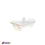 جاط لتقديم مختلف أنواع الطعام، مصنوع من البورسلان المتين وعالي الجودة، يأتي بتصميم مستطيل ورائع، مزود بغطاء زجاجي له مقبض معدن لسهولة فتحه، كما يأتي مع قاعدة معدنية لحمله مما يضفي لمسة أنيقة وفاخرة على مائدة الطعام