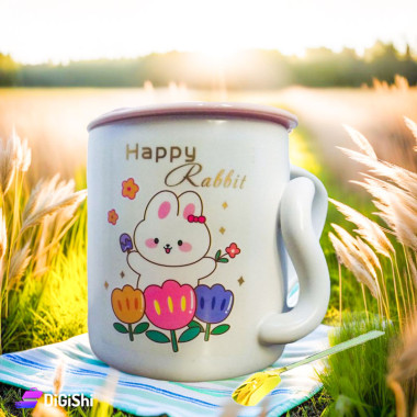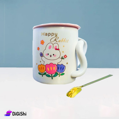 كوب بورسلان مع غطاء وملعقة Happy Rabbit مع ورود