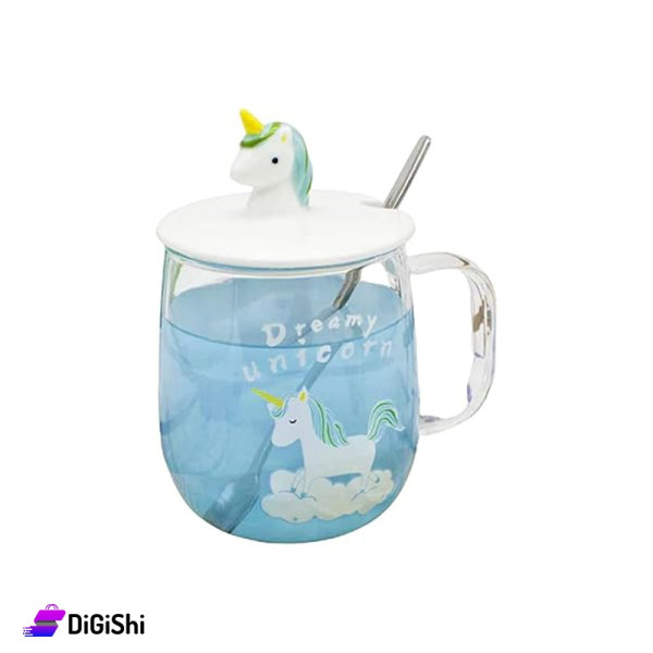 كوب زجاجي بتصميم مميز ورائع، يأتي برسمة وحيد قرن، ومزود بغطاء بمجسم وحيد قرن