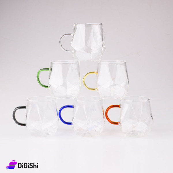 طقم فناجين مكون من 6قطع مصنوعة من البيركس عالي الجودة متين وخفيف، يتميز بتصميم جميل ورائع بشكل مضلع، وكل فنجان له لون يد مختلفة