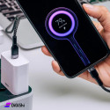 كابل الشحن السريع وناقل البيانات مصنوع من مادة متينة مغلفة بنسيج الصوف المضفر خالٍ من التشابك وسهل التخزين، يتميز بأنه يعمل على ضبط الجهد الكهربائي بشكل مثالي حسب إحتياجات الجهاز