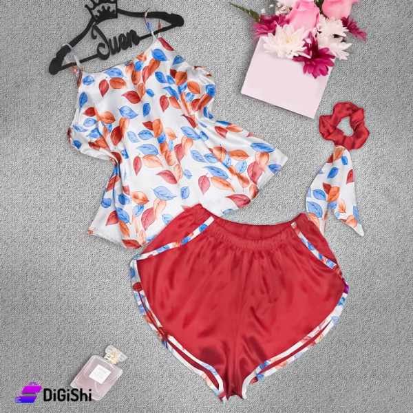 بيجاما نسائية ساتان رسمة ورق شجر - أحمر