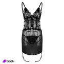 لانجري بتصميم مميز وجذاب، يأتي بشكل فستان قصير مكشوف الظهر، مصنوع من قماش الشيفون، والصدر من الدانتيل المطرز ولع أسياخ، يأتي مع سترينغ، كما أنة مزود بربطات توضع على الفخد