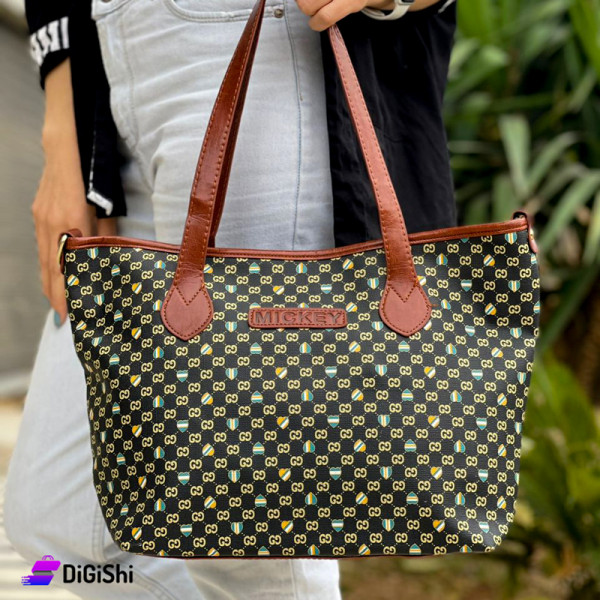 حقيبة كتف نسائية قماش وجلد مطرزة بأشكال فضية لامعة لون أسود