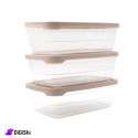 مجموعة تبروير مصنوعة من البلاستيك لحفظ الأطعمة، مؤلفة من ثلاث قطع بأحجام متساوية، شفافة مع غطاء ملون محكم الإغلاق، مصممة بشكل أنيق وعملي حيث من الممكن وضعها في الثلاجة أو في خزائن مطبخك من دون أن تأخذ مساحة كبيرة