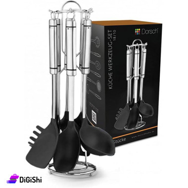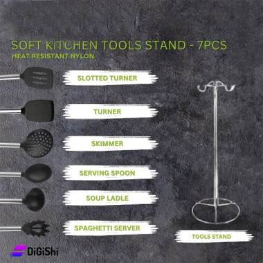 طقم ملاعق سكب مع حمالة ستانلس ستيل 7 قطع لون فضي وأسود...