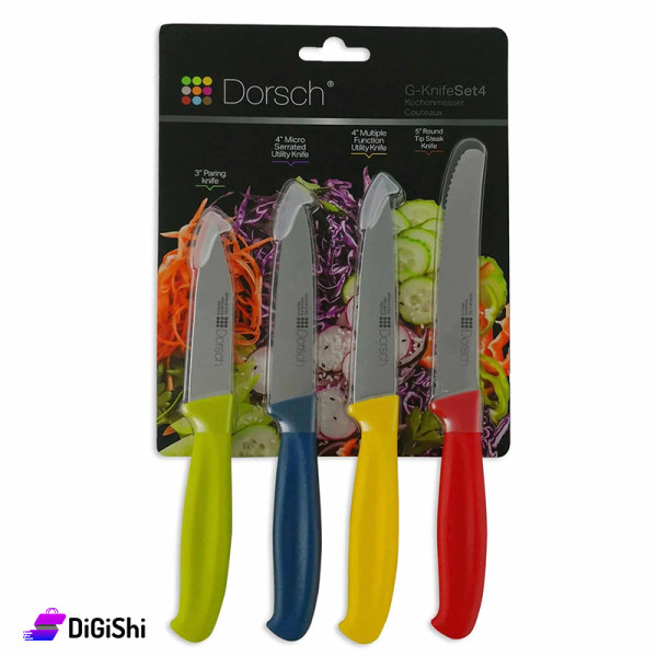 طقم سكاكين مكون من4 قطع، مصنوع من الستانلس ستيل المقام للصدأ، يتميز بتصميم عريض وشفرات قاطعة وحادة، وبقوة تصنيع مثالية ليتحمل تقطيع الأشياء القاسية
