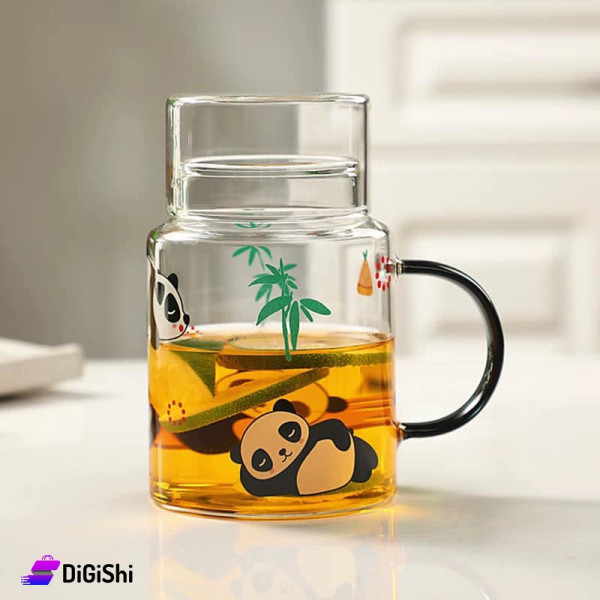 إبريق زجاج صغير مع كوب رسمة باندا ومسكة لون أسود