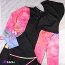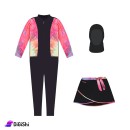 بوركيني مؤلف من 3 قطع، أفارول بروكيني بأكمام طويلة وتنورة منفصلة يمكن ارتدائها على الخصر لسهولة التحرك، وطاقية بشكل حجاب، بتصميم جذاب وعصري تتداخل الألوان الزاهية في التصميم لتضيف إليه حيوية تنسجم مع فصل الصيف
