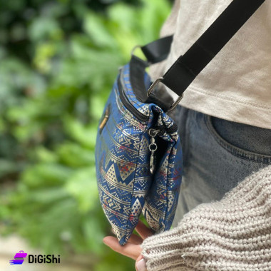 Shoulder bag with distinctive design Made of fabric on the front with shiny silver accents It is leather from the back face It consists of one main layer Back zip...
