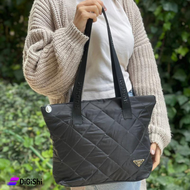 حقيبة نسائية كبيرة قماش نقشة معينات مع شعار PRADA لون أسود