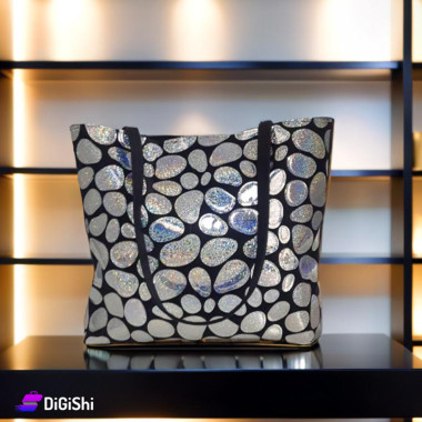 حقيبة كتف نسائية قماش وجلد مطرزة بأشكال فضية لامعة لون أسود