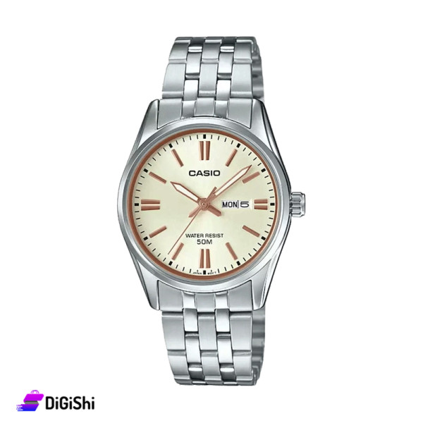 ساعة يد نسائية، بتصميم أنيق كلاسيكي وفاخر، مصنوعة من سوار ستانلس ستيل مقاوم للصدأ، ومشبك ثلاثي الطيات، تتميز بشاشة عرض تناظرية مصنوعة من الزجاج المعدني