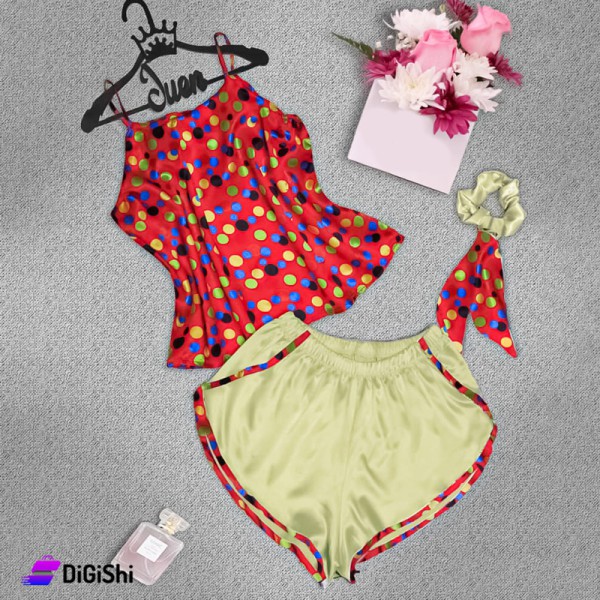 بيجاما نسائية ساتان رسمة دوائر - أحمر