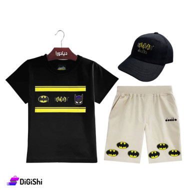 Boys' set made of cotton Consists of three pieces Half-sleeved sweater, shorts and hat Batman logo drawing Size for ages 8-14 years