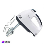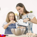 Electric hand whisk, made of durable plastic, with two stainless steel kneading and whisking paddles, used for whipping eggs and cream and for blending ingredients together