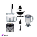 It consists of a 2-liter food processor for chopping meat, onions, and vegetables, in addition to a blender for chopping fruits and preparing cocktails, juices, and cake mixes. It also includes a slicing and grating device, and comes with a citrus juicer 1.8-liter