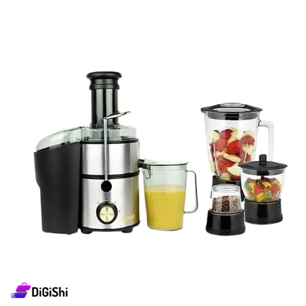 A complete set of electrical appliances, it comes with an electric juicer with a 2.2-liter container, a steel body, and a 1-liter juice jug.
