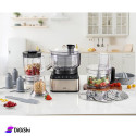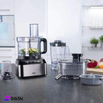 It includes a 2.1-liter food processor for chopping meat, onions, and vegetables, as well as a blender for chopping fruits and preparing cocktails, juices, and cake mixes. It also includes a grinder for grinding coffee and spices, a fruit juicer, a citrus press attachment, and a set of stainless steel discs for all types of grating and slicing.