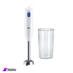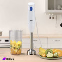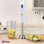 Hand blender with a distinctive vertical design that allows access to various deep bowls. It is used for blending and chopping fruits and vegetables. It is made of stainless steel blades that do not rust.
