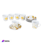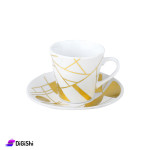 A set of coffee cups and saucers made of high-quality porcelain, which maintains the heat of your coffee for a long time so that you can enjoy your coffee time until the end, The set is made with precision and fine craftsmanship, with a scratch resistant gold engraving and a comfortable handle to hold the cup, in addition to its perfect size and weight