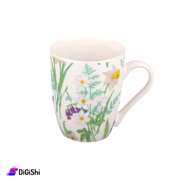 A cup made of ceramic, characterized by an elegant, beautiful, and eye-catching design. It comes with a pattern of leaves and flowers in bright colors, which gives it an elegant and wonderful touch