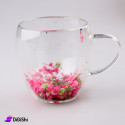A heat-resistant transparent glass cup, featuring a wonderful and attractive design, designed from two layers of heat-resistant glass and containing roses in different shapes and colors between these two layers