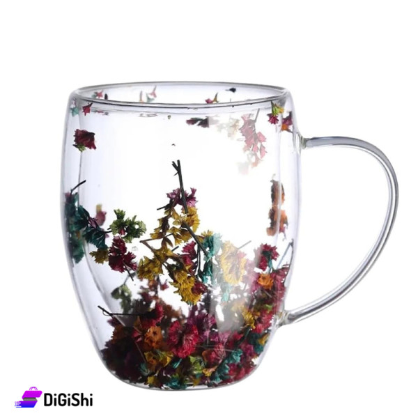 A heat-resistant transparent glass cup, featuring a wonderful and attractive design, designed from two layers of heat-resistant glass and containing roses in different shapes and colors between these two layers