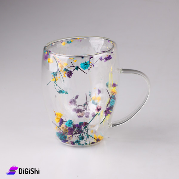 A heat-resistant transparent glass cup, featuring a wonderful and attractive design, designed from two layers of heat-resistant glass and containing roses in different shapes and colors between these two layers