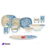 A set for serving food in an elegant and distinctive way made of the finest types of glass, characterized by its large number of pieces that suit different types of dining and serving