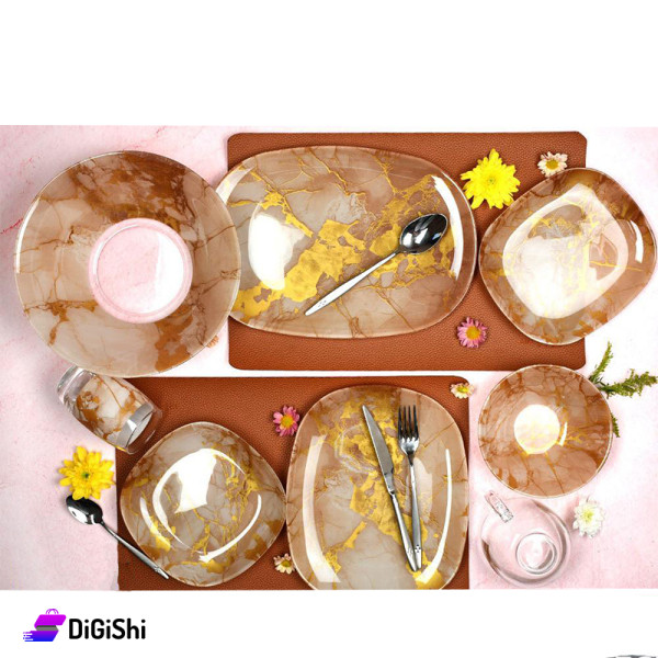 A set for serving food in an elegant and distinctive way made of the finest types of glass, characterized by its large number of pieces that suit different types of dining and serving