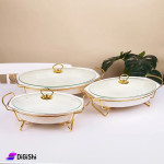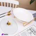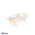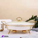A serving bowl for various types of food, made of durable and high-quality porcelain. It comes with a beautiful oval design, equipped with a glass lid with a metal handle for easy opening. It also comes with a metal base for carrying it, which adds an elegant and luxurious touch to the dining table
