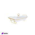 A serving bowl for various types of food, made of durable and high-quality porcelain. It comes with a beautiful Rectangular design, equipped with a glass lid with a metal handle for easy opening. It also comes with a metal base for carrying it, which adds an elegant and luxurious touch to the dining table