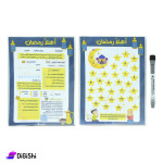 A plastic sheet on which one can write and draw using the attached pen designated for it, and what has been written can be erased repeatedly with the sponge at the tip of the pen, through which the child remembers the days and times of prayer during the month of Ramadan in a fun and entertaining way, which encourages the child to recite the day’s remembrances and Iftar supplications in a smoother way