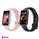 The Huawei smart watch has an elegant rectangular frame design made of reinforced polymer fiber materials. It includes a high-brightness and high-resolution AMOLED color screen with a size of 1.47 inches and a resolution of 194 x 368 pixels and a pixel density of 282 per inch, in addition to a silicone strap that can be easily changed according to sports or recreational use