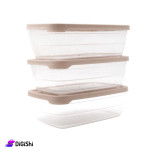Tupperware set made of plastic for food preservation, consisting of three transparent pieces of the one size with a colorful tight-fitting lid, designed in a stylish and practical way that can be placed in the refrigerator or in your kitchen cupboards without taking up much space